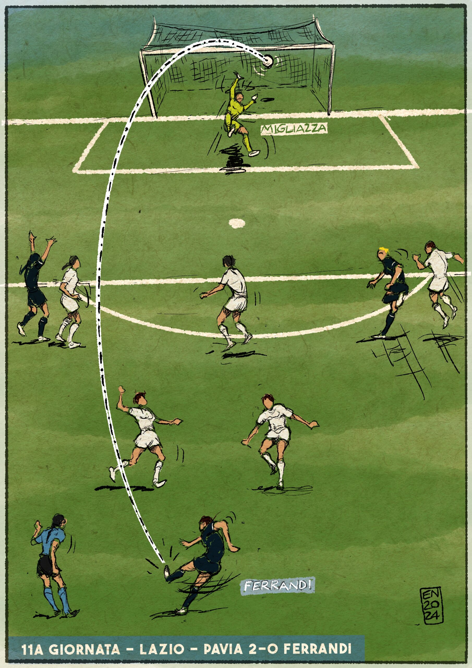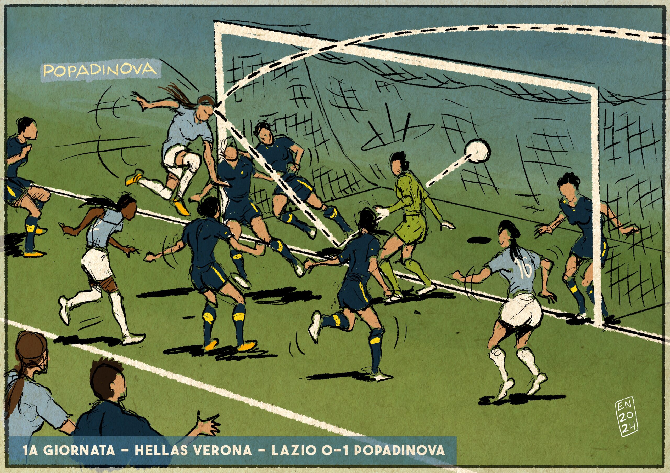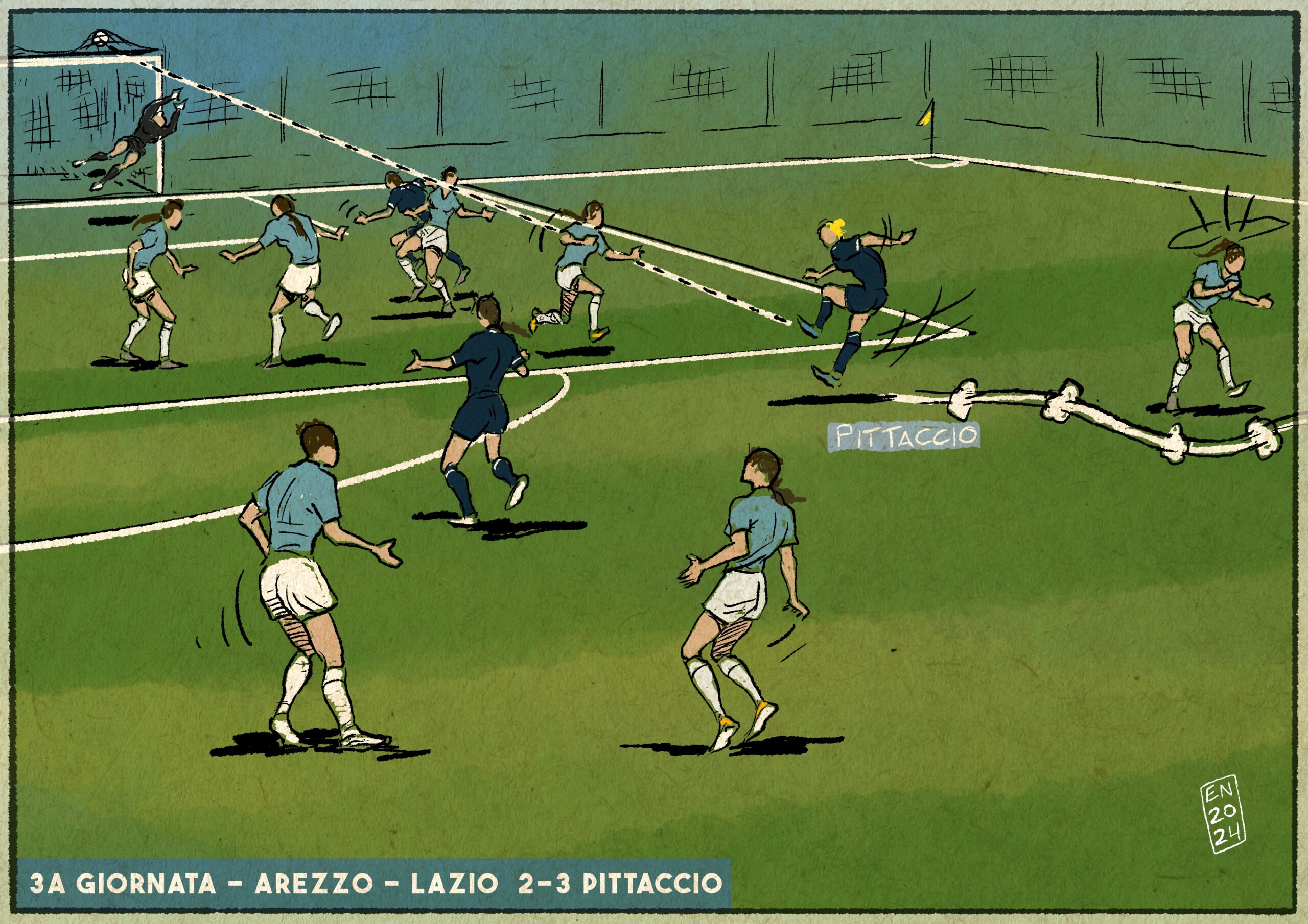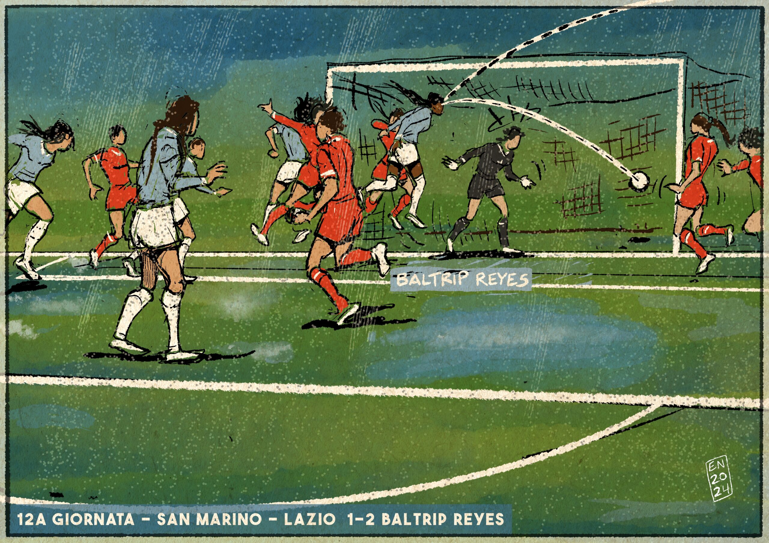 Questo è uno dei motivi che mi ha portato a realizzare un cofanetto di diciannove cartoline, in ognuna delle quali ho disegnato un gol per ciascuna calciatrice che ha segnato un gol per la Lazio nel vittorioso campionato di serie B 2023-24.