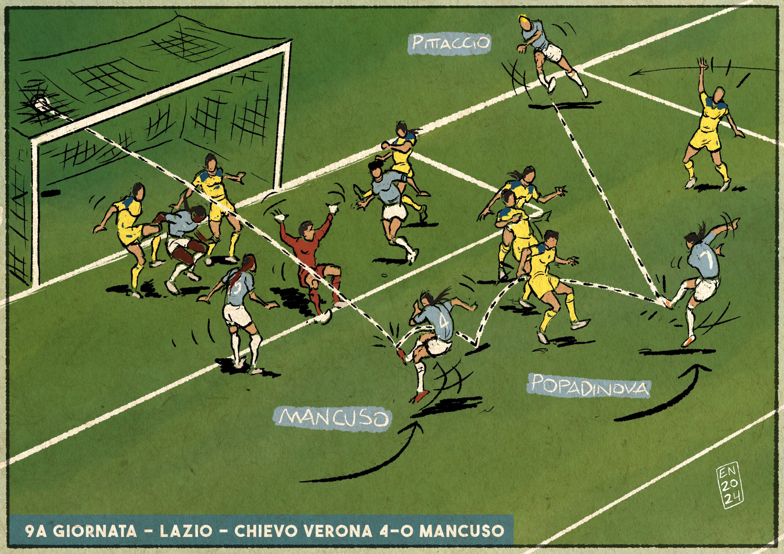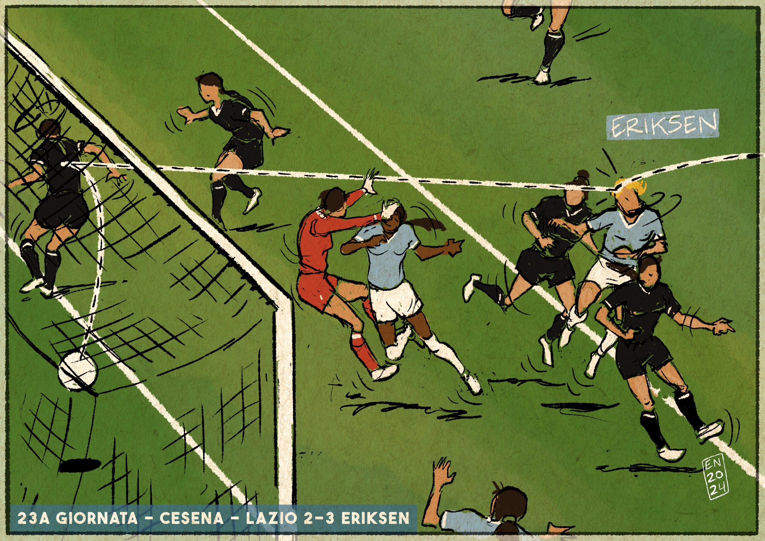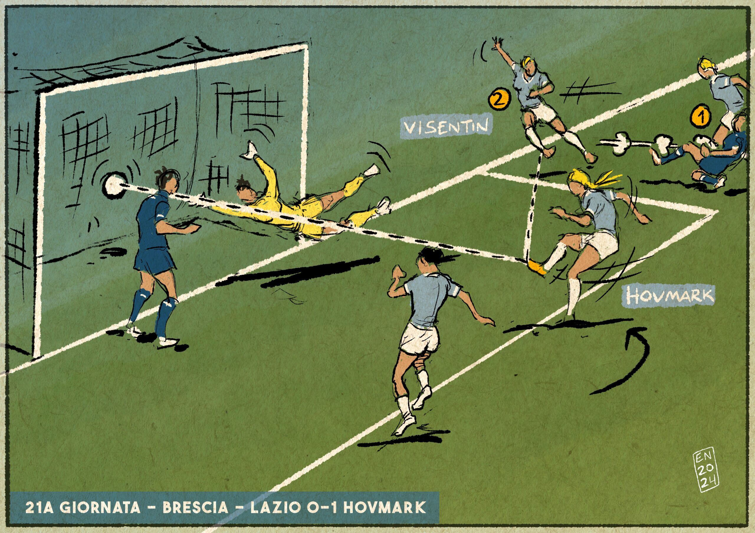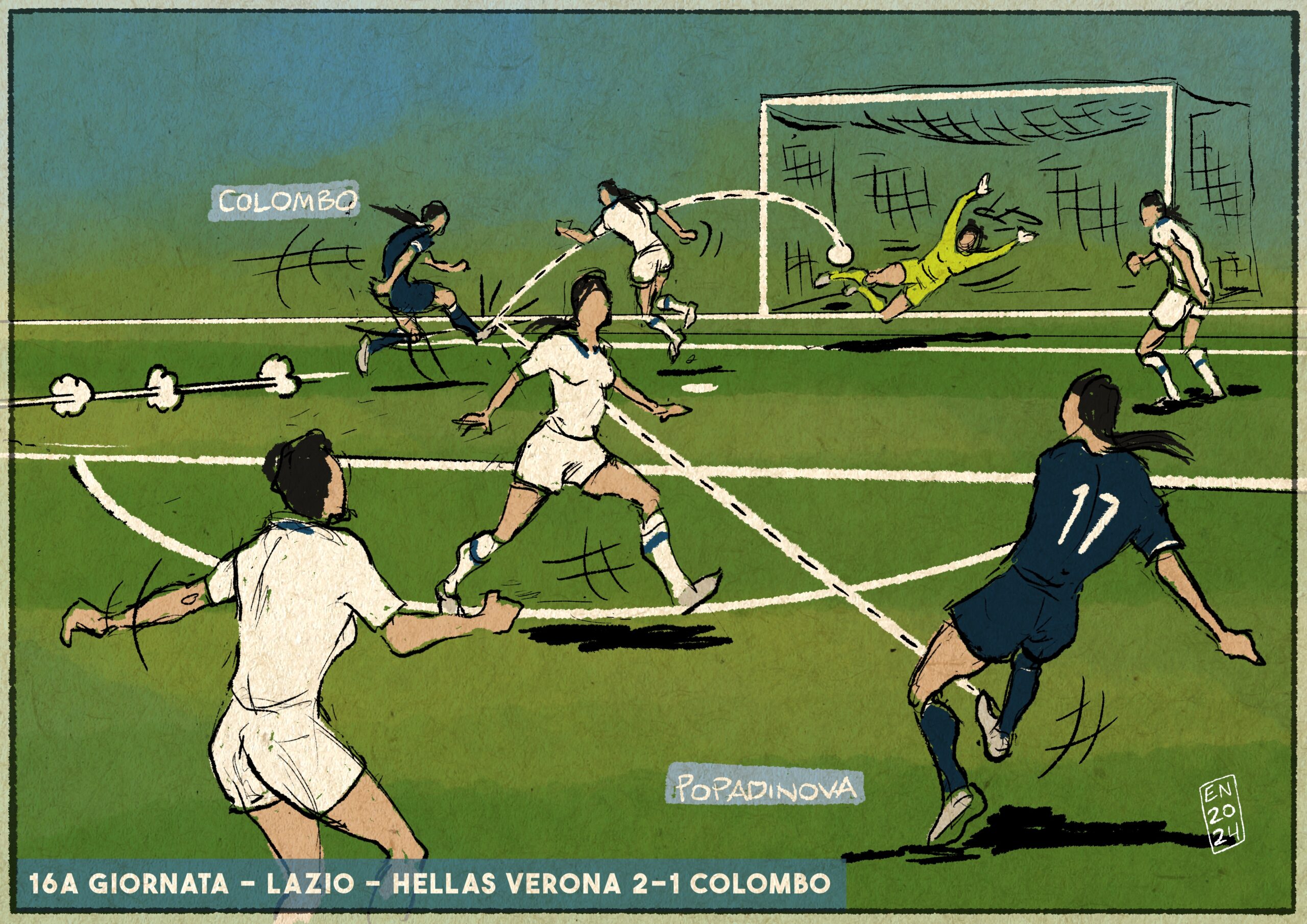 Questo è uno dei motivi che mi ha portato a realizzare un cofanetto di diciannove cartoline, in ognuna delle quali ho disegnato un gol per ciascuna calciatrice che ha segnato un gol per la Lazio nel vittorioso campionato di serie B 2023-24.