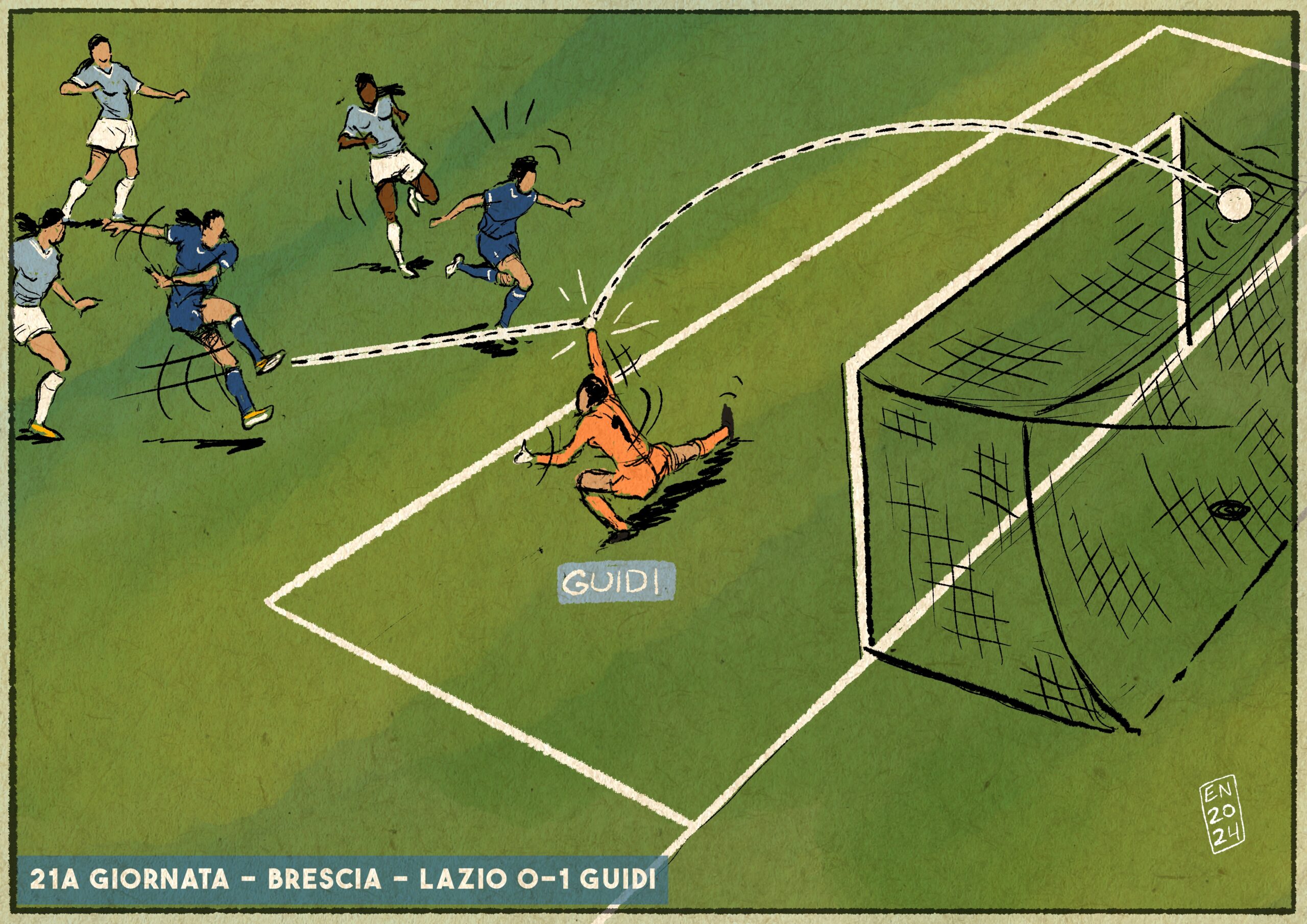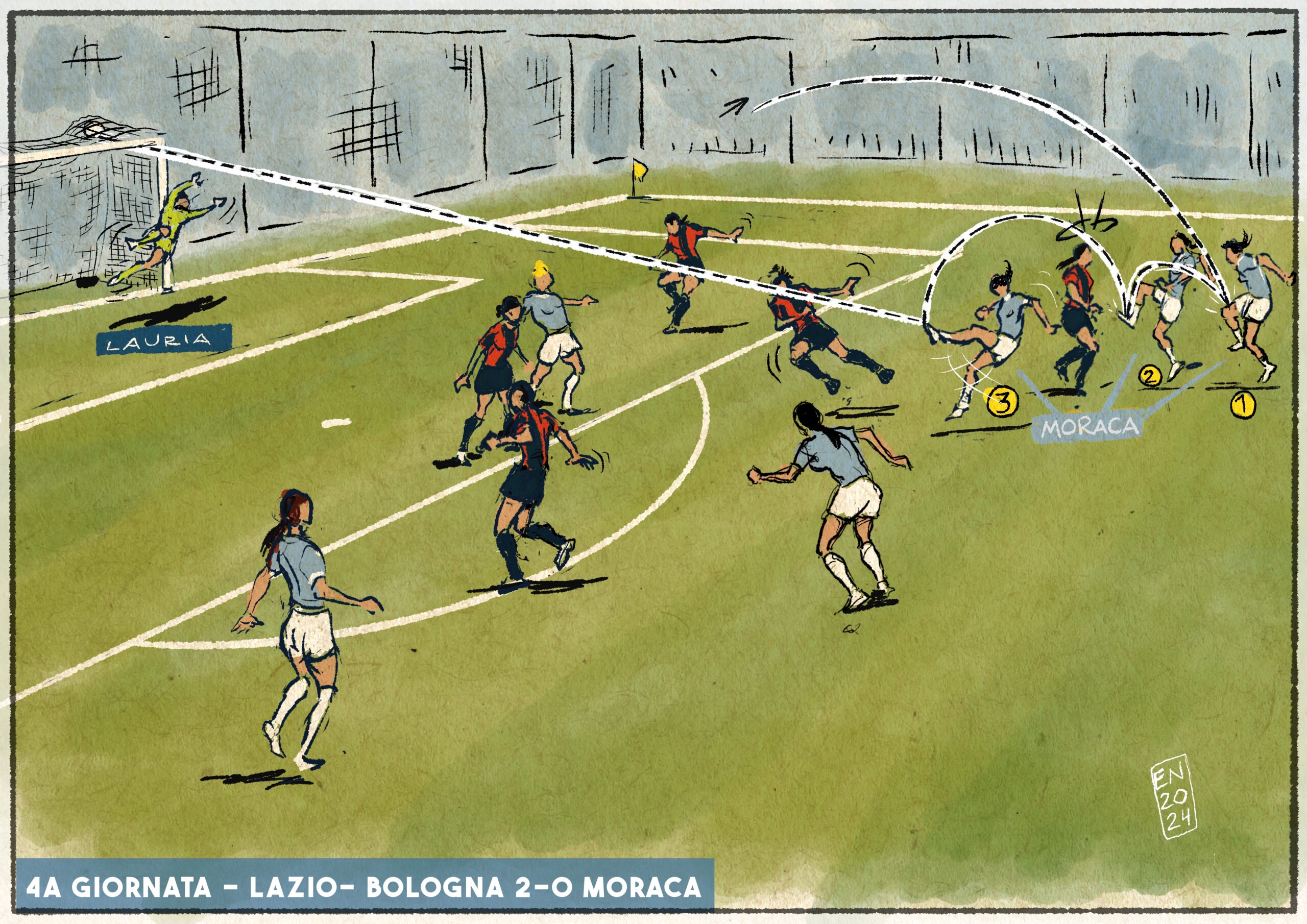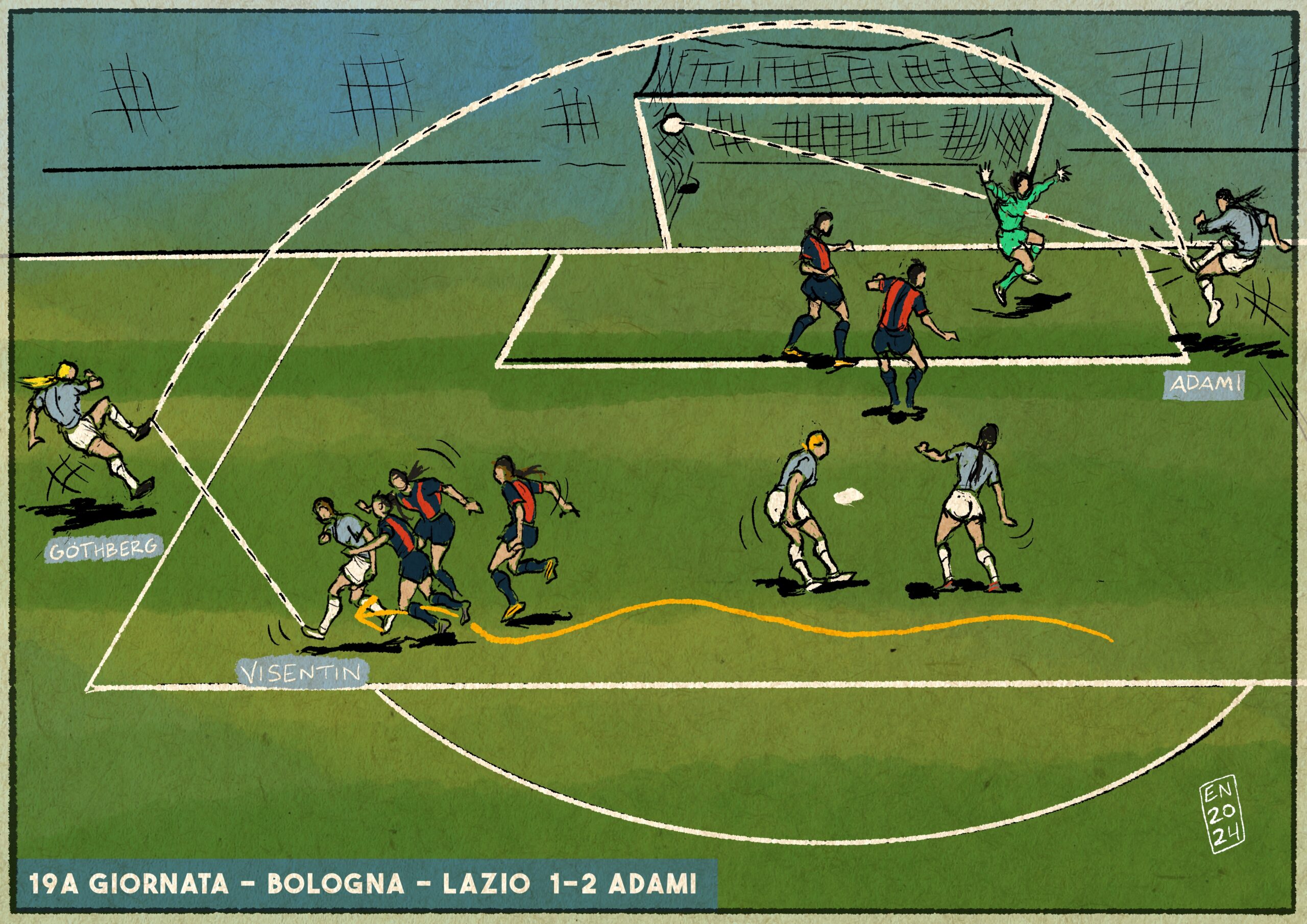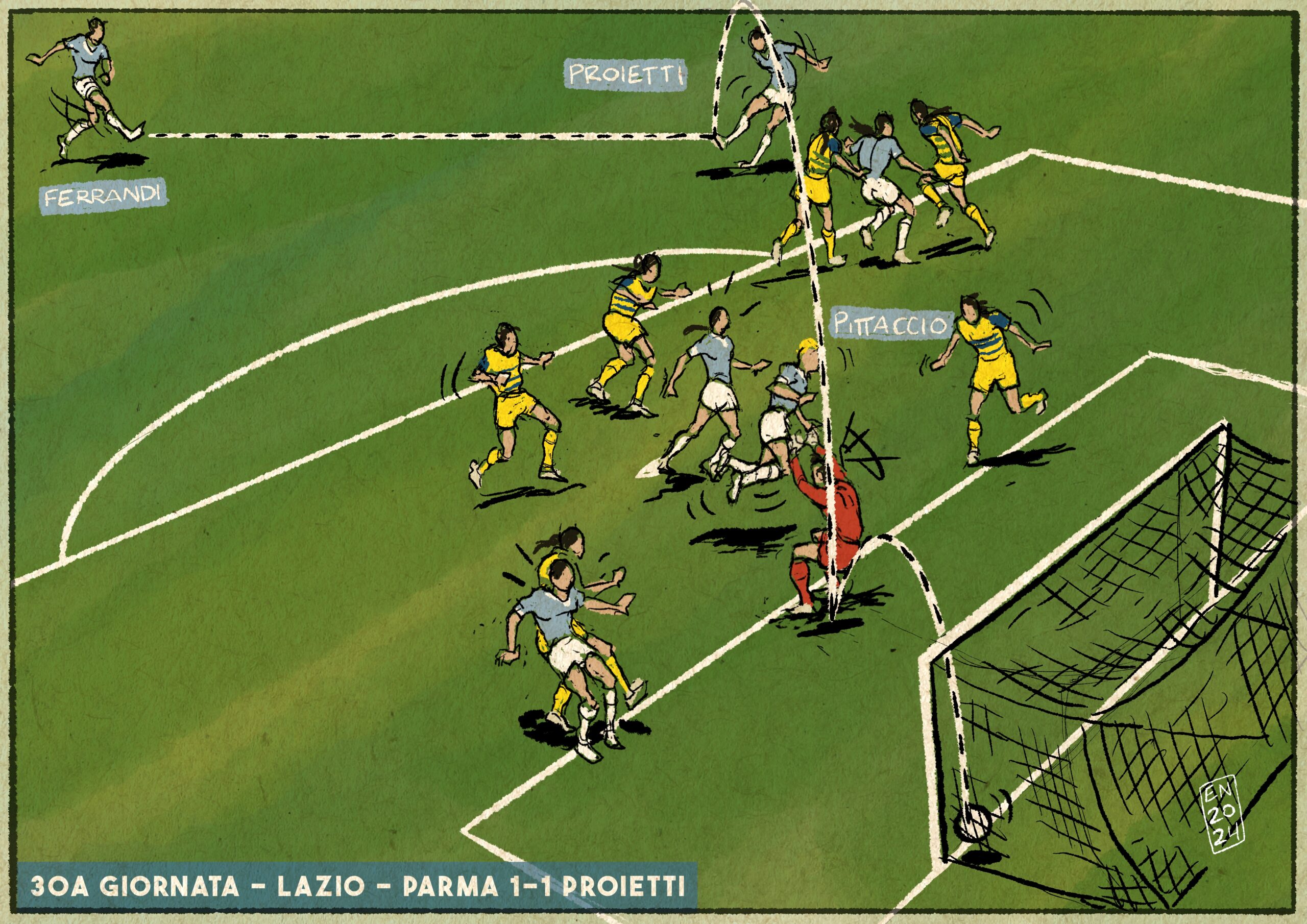 Questo è uno dei motivi che mi ha portato a realizzare un cofanetto di diciannove cartoline, in ognuna delle quali ho disegnato un gol per ciascuna calciatrice che ha segnato un gol per la Lazio nel vittorioso campionato di serie B 2023-24.